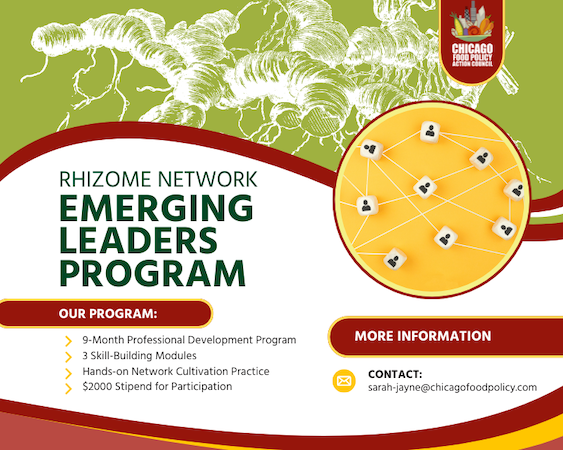 Impact Networks are designed to be centered not around one person, organization, or institution, but rather around shared purpose. To serve that intention, the Rhizome Network aims to cultivate and empower emerging leaders throughout the network to ensure the sustainability, durability, and success of food systems transformation in Chicagoland. CFPAC seeks emerging food system leaders to take on network leadership roles aimed at stewarding network working groups and convening spaces to advance emerging priority projects and build food system resilience, while building skills through training and mentorship.
